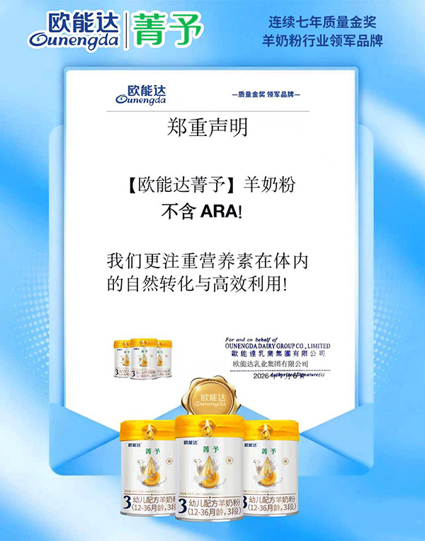 【鄭重聲明】歐能達菁予羊奶粉不含ARA,我們更注重營養(yǎng)素在體內(nèi)的自然轉(zhuǎn)化與高效利用。聲明內(nèi)容如下: